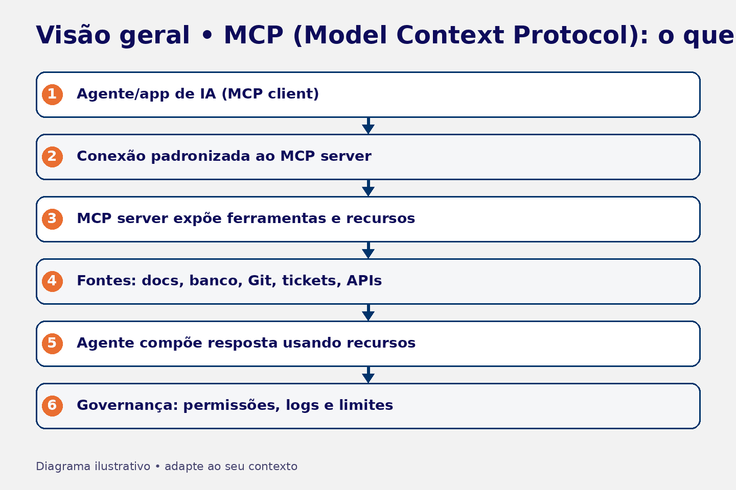 Entenda o MCP (Model Context Protocol): como ele padroniza conexões entre agentes de IA e ferramentas/dados, quando adotar, arquitetura cliente/servidor e checklist de segurança.
