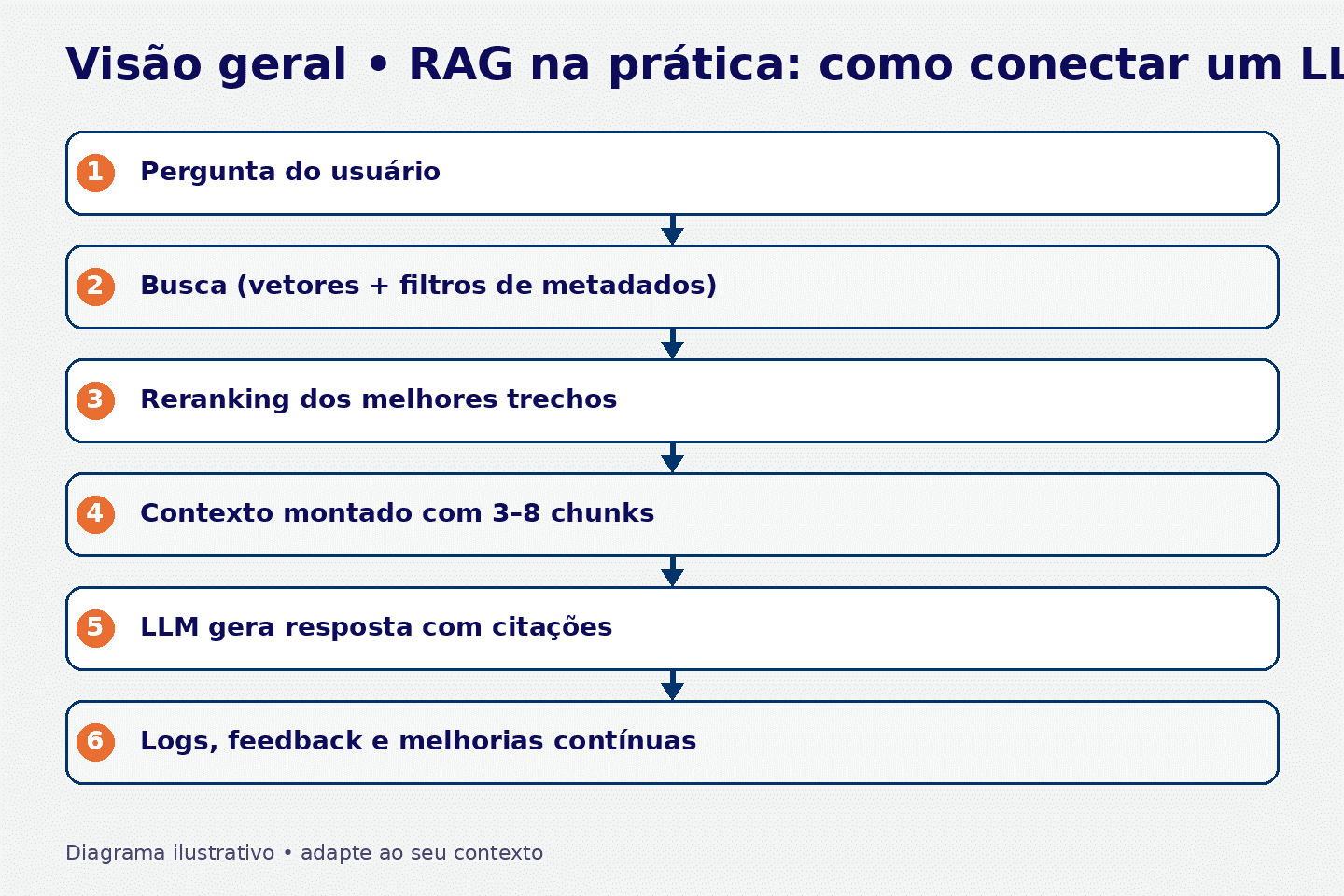 O ponto-chave: o LLM não deve inventar a base. Ele deve usar o que foi recuperado e, quando não houver evidência, assumir “não sei”.
