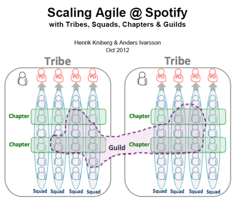 At Spotify, agile methodology was implemented through the Squad structure, which is focused on development. A Squad aims to be a mini-startup inside the larger startup, self-organizing and deciding on its own which internal processes to follow.